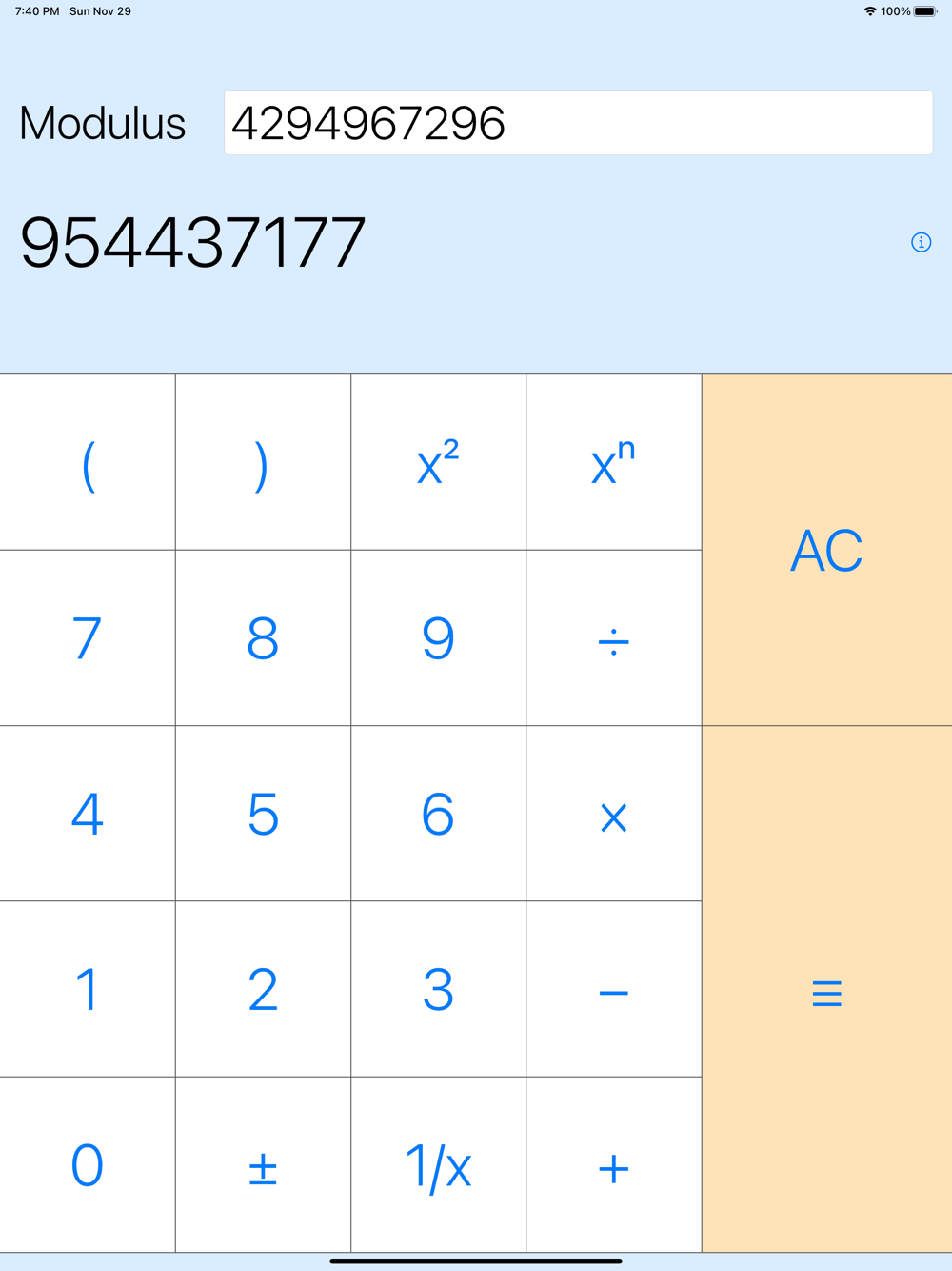 A calculator for arithmetic modulo N. It lets you choose a fixed modulus, and then make lots of calculations without having to press a "mod" button again and again. It also: