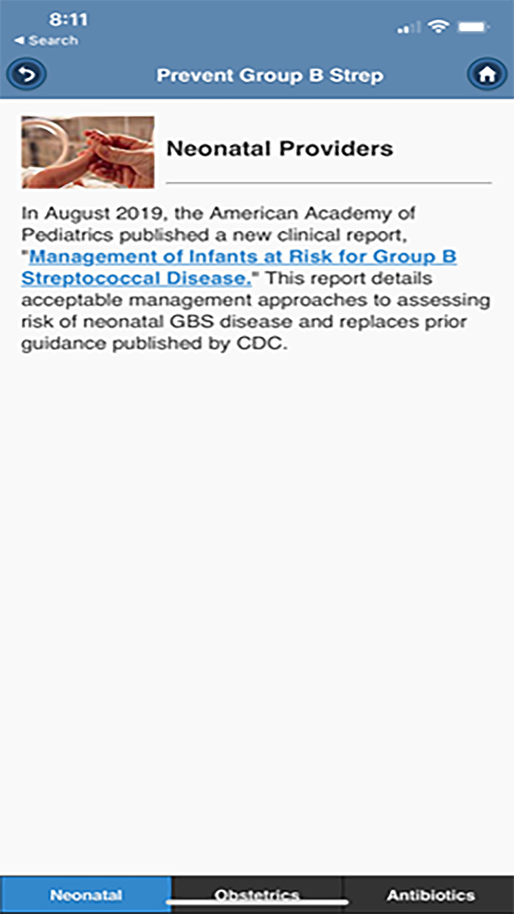 This is the Prevent Group B Strep App created by the Centers for Disease Control and Prevention (CDC) with the American Academy of Pediatrics (AAP), American College of Obstetricians and Gynecologists (ACOG), American Academy of Family Physicians (AAFP), and the American College of Nurse-Midwives (ACNM).