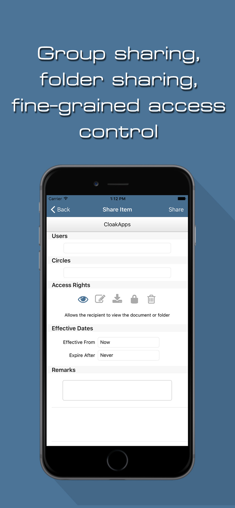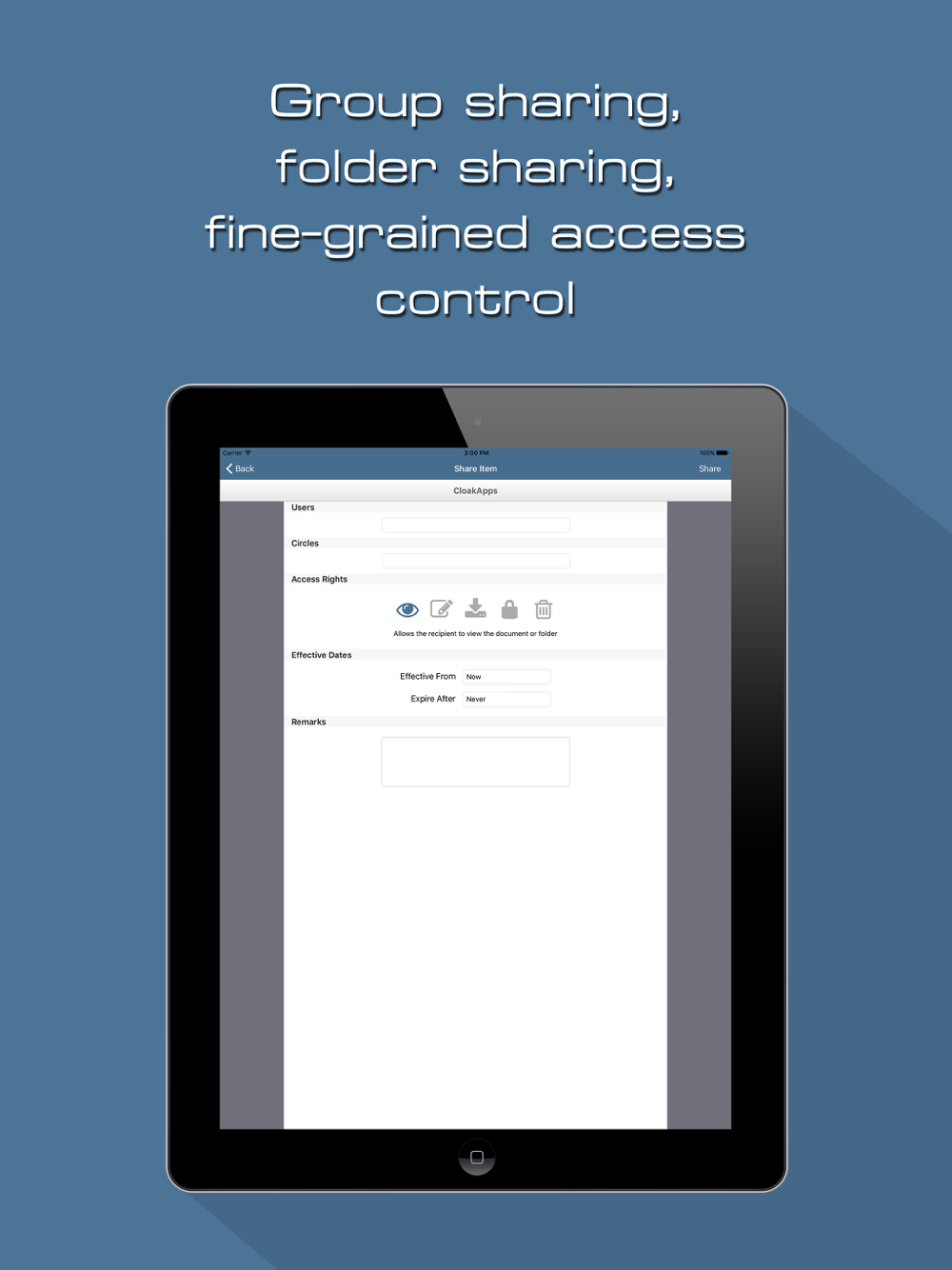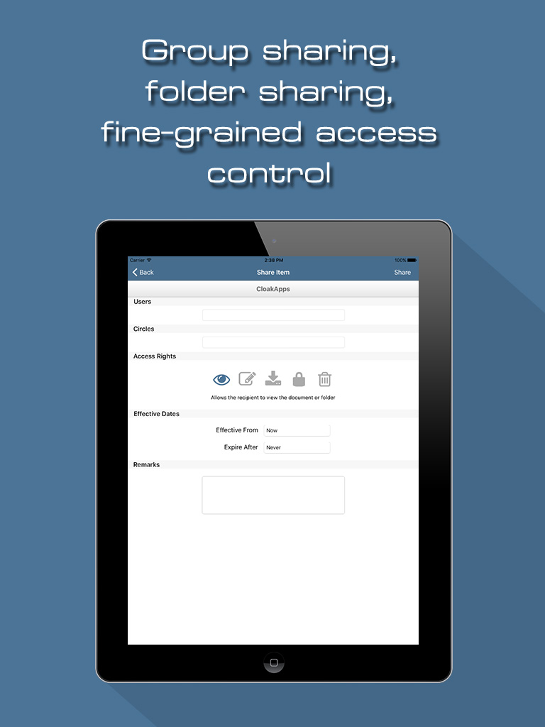 1. Digital rights management. Share text / markdown, pdf and images with read-only access to specific recipients. Documents and folders can be shared to individual users or hierarchical user groups, with fine-grained access rights.