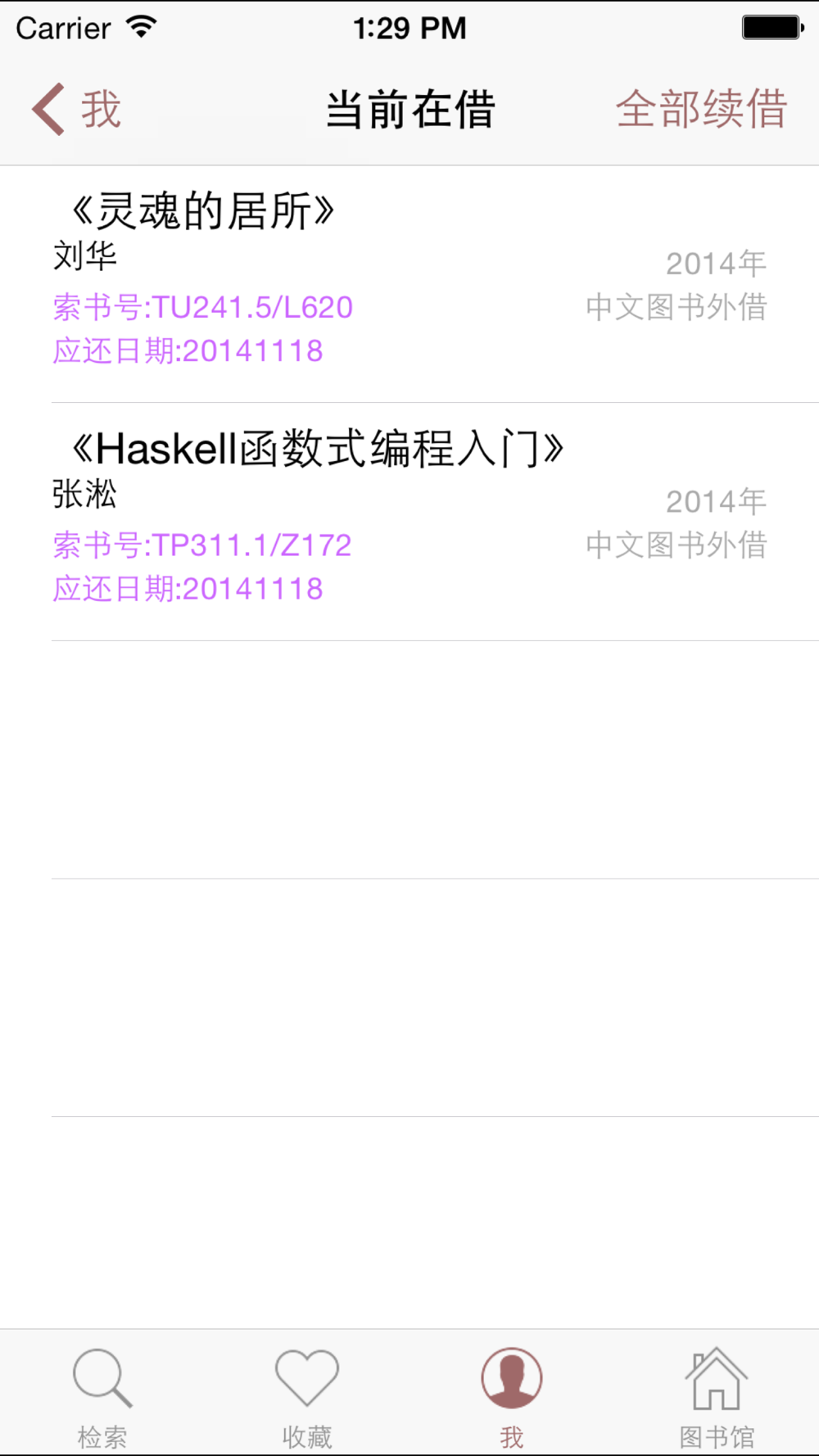 4、个人图书馆,登录/查阅个人借阅/历史借阅/预约申请/荐购记录/未付款项;并进行单本续借及全部续借;