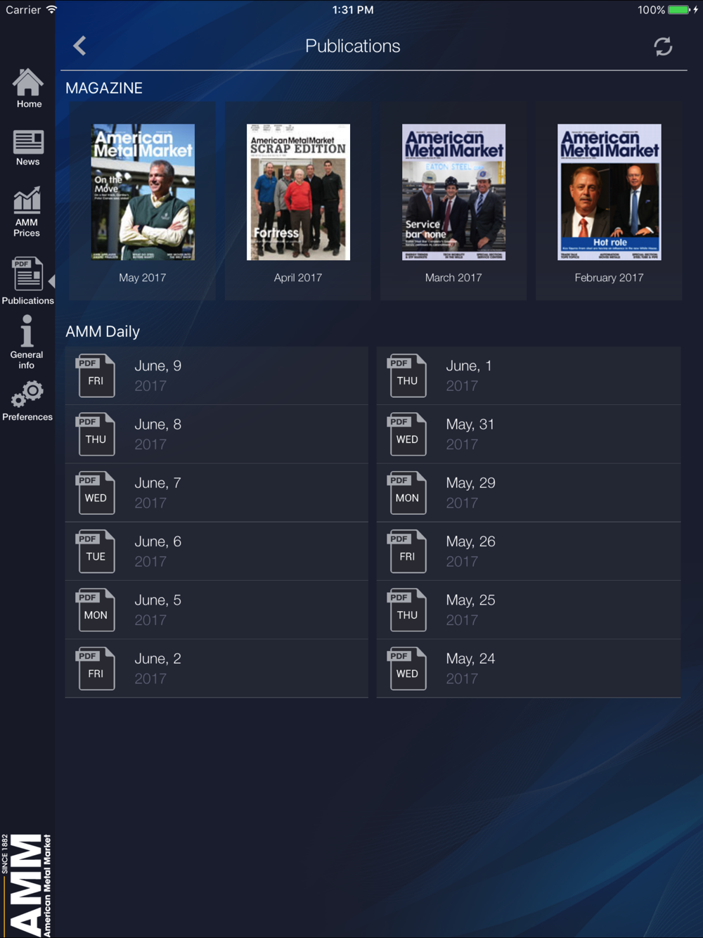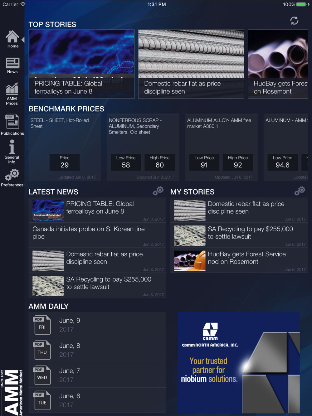 The American Metal Market app for iPad and iPhone gives subscribers and trialist complete access to the latest steel, scrap and nonferrous metals news and pricing intelligence on the North American markets. Now, subscribers can access AMM's news and pricing intelligence on-the-go and save the Daily pdf for offline reading, making the AMM iPad and iPhone apps your perfect travel accessory. Access all previously saved news articles and pricing from anywhere. The AMM default home screen shows top stories, saved ‘My Prices’ and the latest news to give subscribers a quick snapshot immediately upon login.