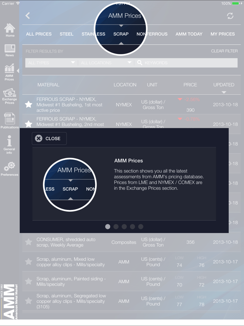 Exchange Prices – The AMM app offers exchange prices for the following: NYMEX/COMEX, LME AM prices, LME PM prices and LME 2 day comparison.