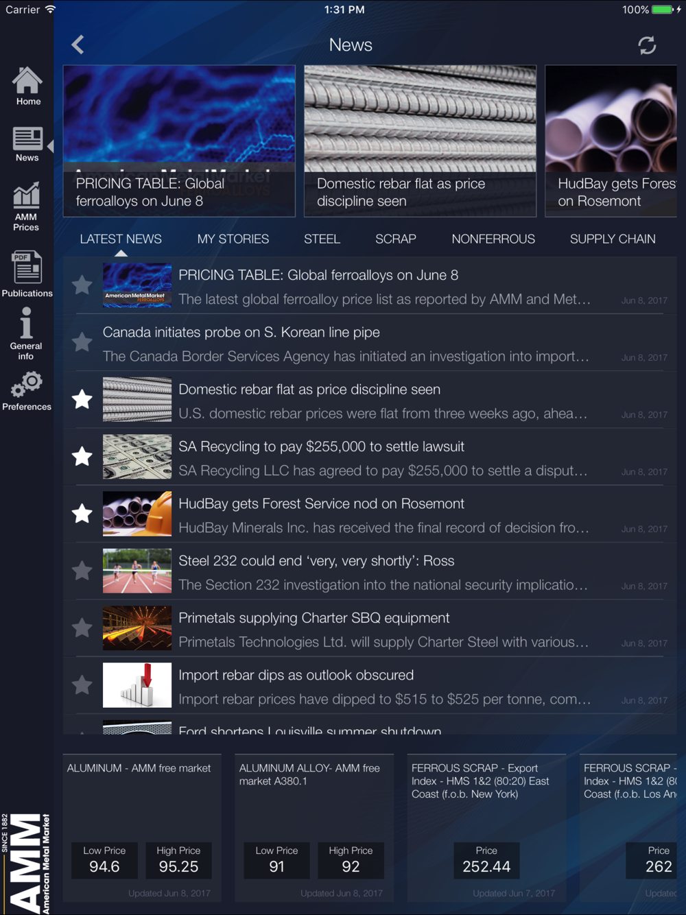 News - Easily view latest news stories in a preferred metal industry and save stories to the ‘My Stories’ section to go back to later. The news section separates metals news into ‘My Stories,’ steel, scrap, nonferrous, supply chain and china watch making navigating the app quick and seamless.