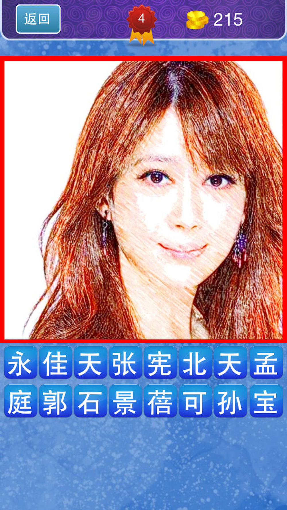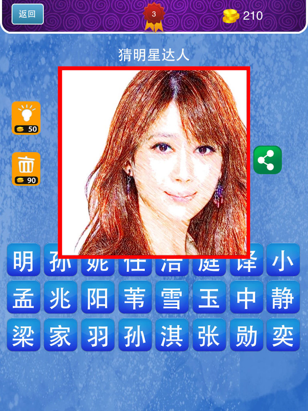 游戏需要你根据明星的图片从24个汉字中点选出明星的名字才可通过一关。我们精心收集并处理了300多张明星的图片。有歌星,影星及主持人等。众多的关卡一定让你玩过瘾。