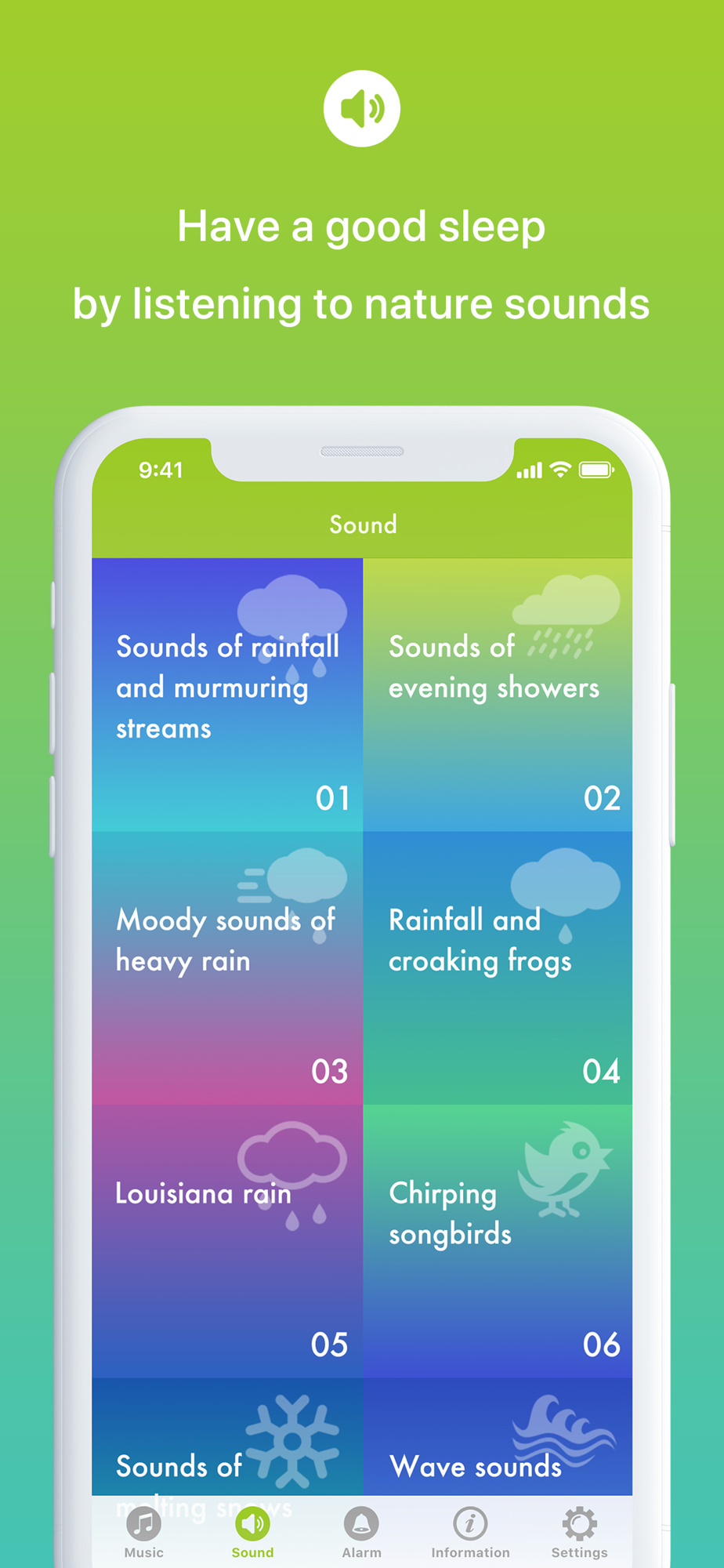Ambient sounds such as rain will gradually decrease in volume when the set time comes before becoming silent so as not to disturb your sleep. Before going to sleep, playing the babbling of a stream, for example, will cause you to relax and fall into a comfortable slumber before you know it.