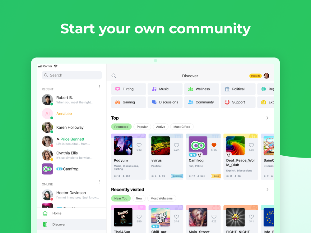 In Camfrog, you can start a random video chat with strangers or catch up with friends in our group video chat rooms. Our app is suitable for adult chatting - start a conversation and find meaningful connections!