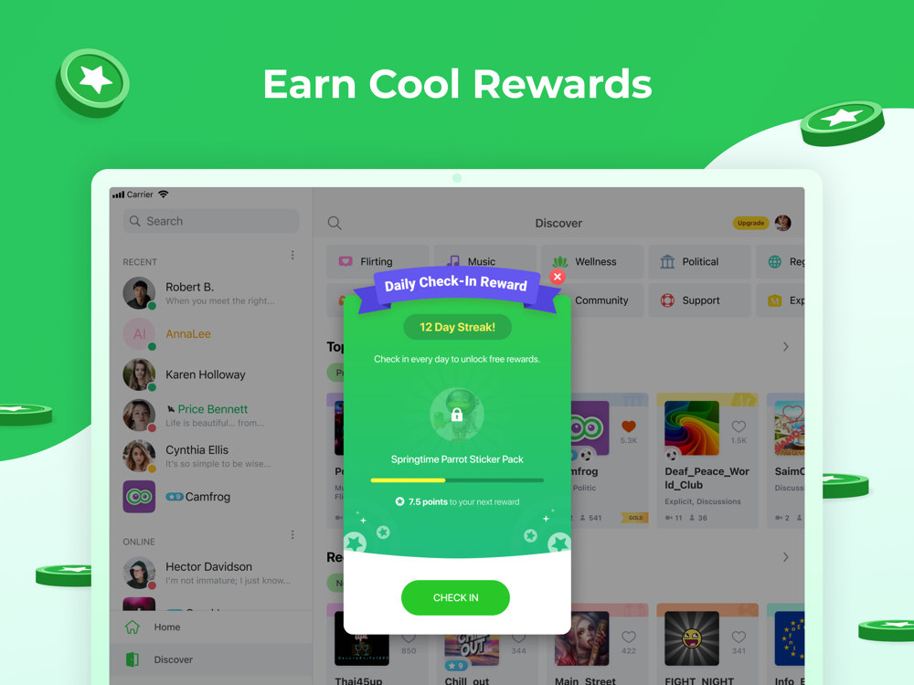 Earn exciting rewards like experience points, bonus coins, unique virtual gifts, and special status as a Camfrog member by simply engaging with the app.