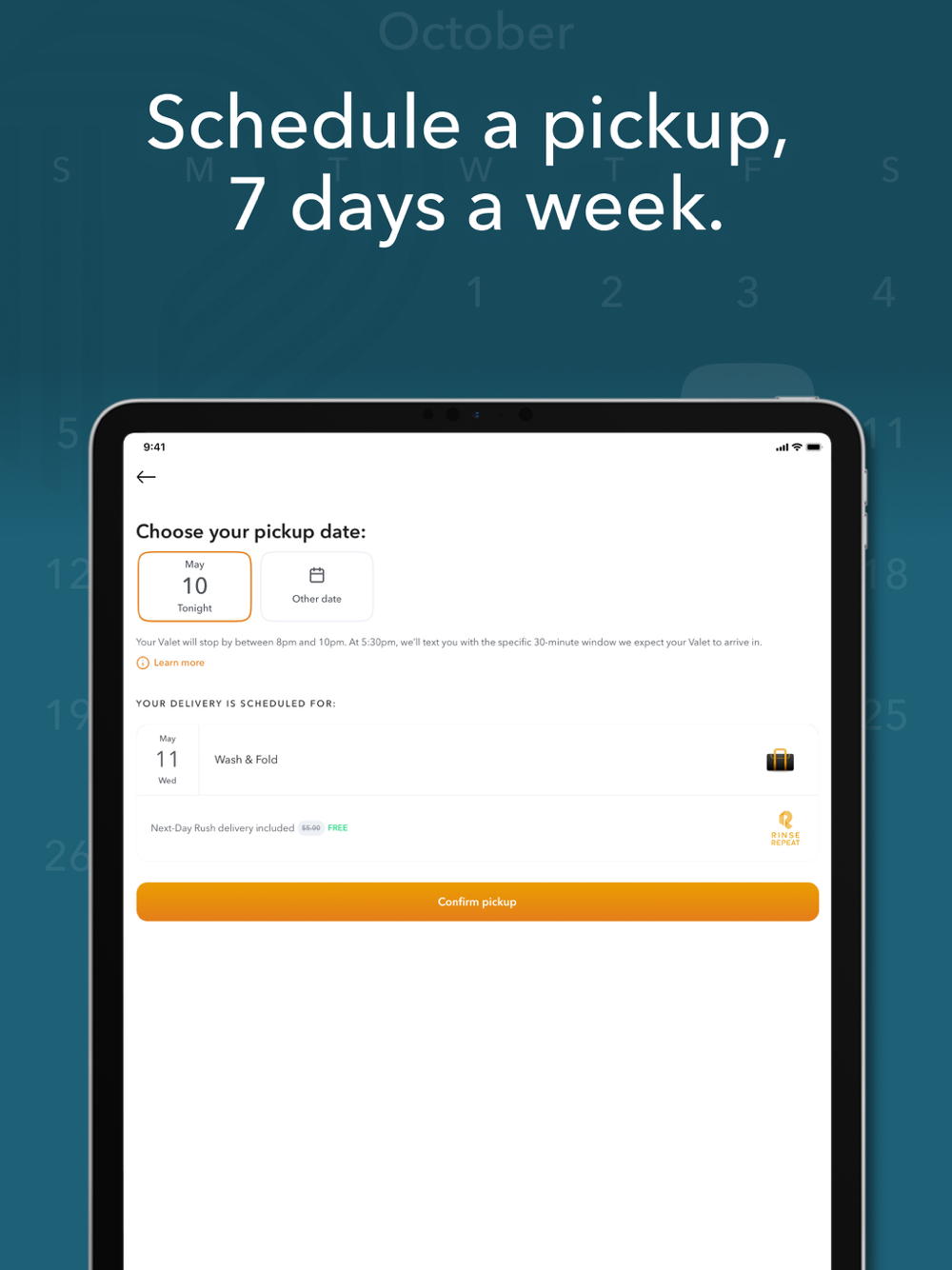 Schedule your pickup for any day of the week. Our service window is 8pm to 10pm, 7 days a week to fit your busy schedule. Use the app to see when your Rinse Valet will arrive.