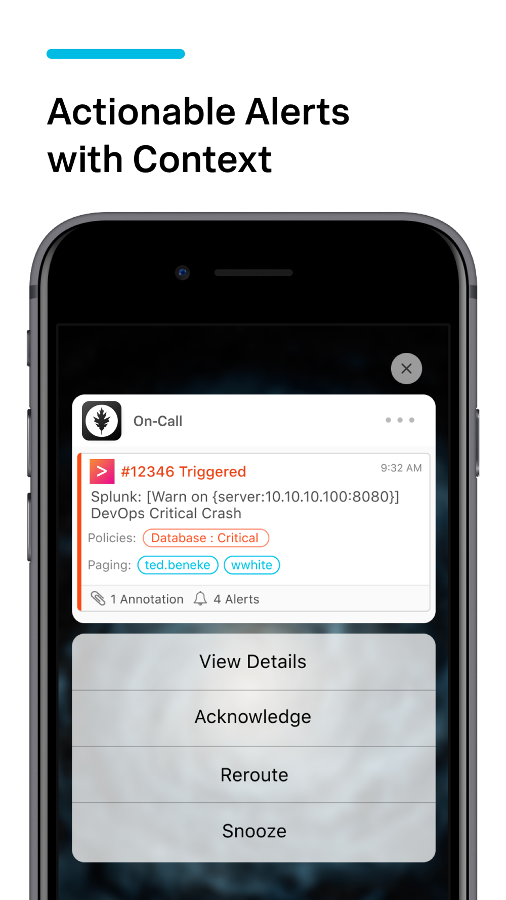 Designed to work in conjunction with the Splunk On-Call service, the iOS application allows on call DevOps teams to: