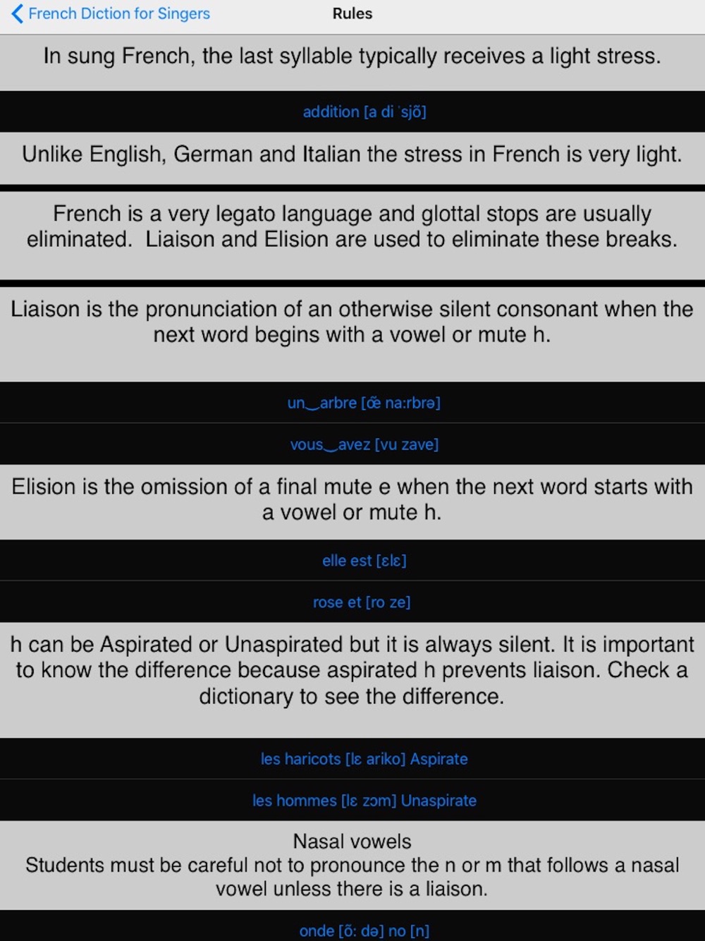 French Diction for Singers is an interactive App for singers and conductors performing in French. It includes over 100 audio examples of French vowel and consonant sounds, an IPA guide, rules for singing in French as well as a built in voice recorder. Use the recorder to check your pronunciation of each audio example in the App. French Diction for Singers was created by a tenured university professor with a doctorate in voice performance and pedagogy.