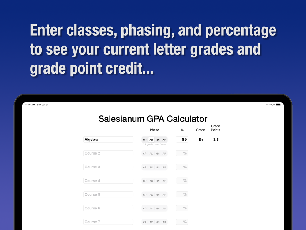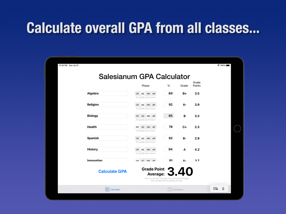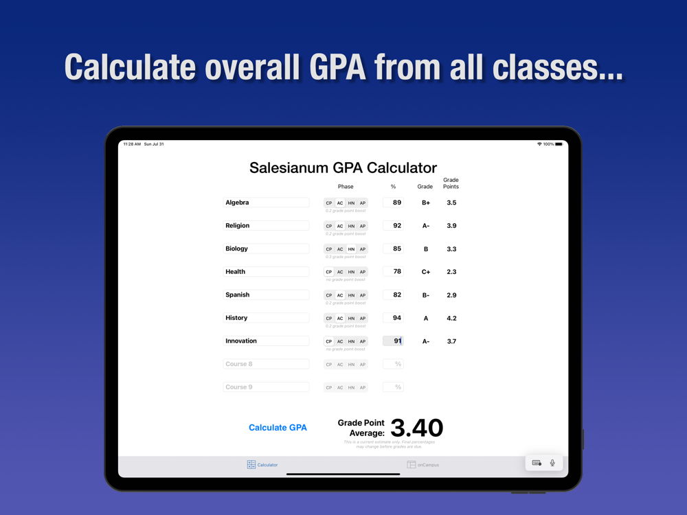 A GPA calculator for Salesianum School. Enter your course names, phases, and current percentages in order to calculate an estimated grade point average (GPA). This calculator gives an estimate, but obviously does not factor final exam grades into the final calculations.