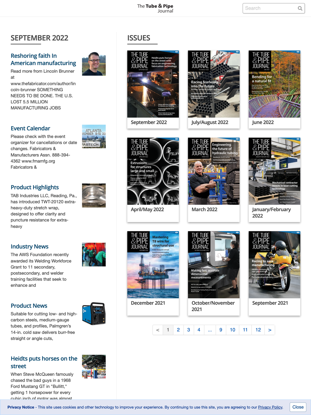 The Tube & Pipe Journal® became the first magazine dedicated to serving the metal tube and pipe industry in 1990. Today, it remains the only North American publication devoted to this industry and it has become the most trusted source of information for tube and pipe professionals.