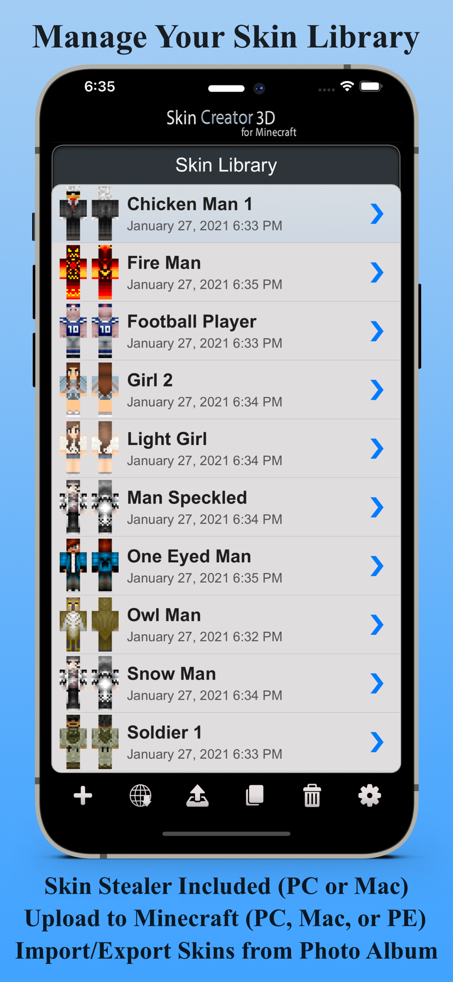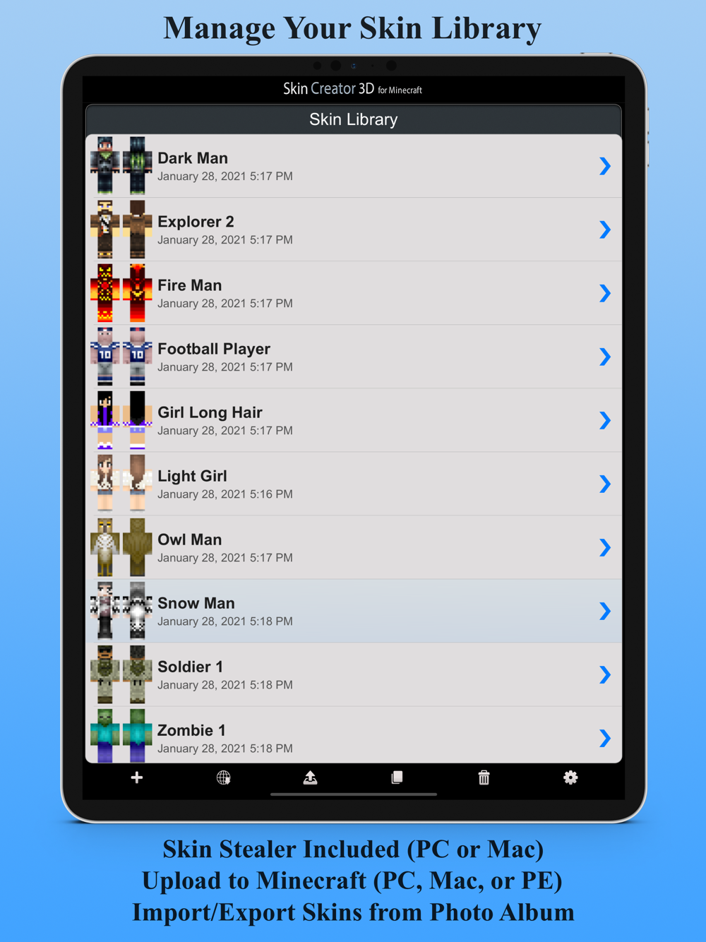 Download skins from popular websites directly into Skin Creator 3D and add them to your library. Manage all of your skins in one app, regardless of where you obtained them.
