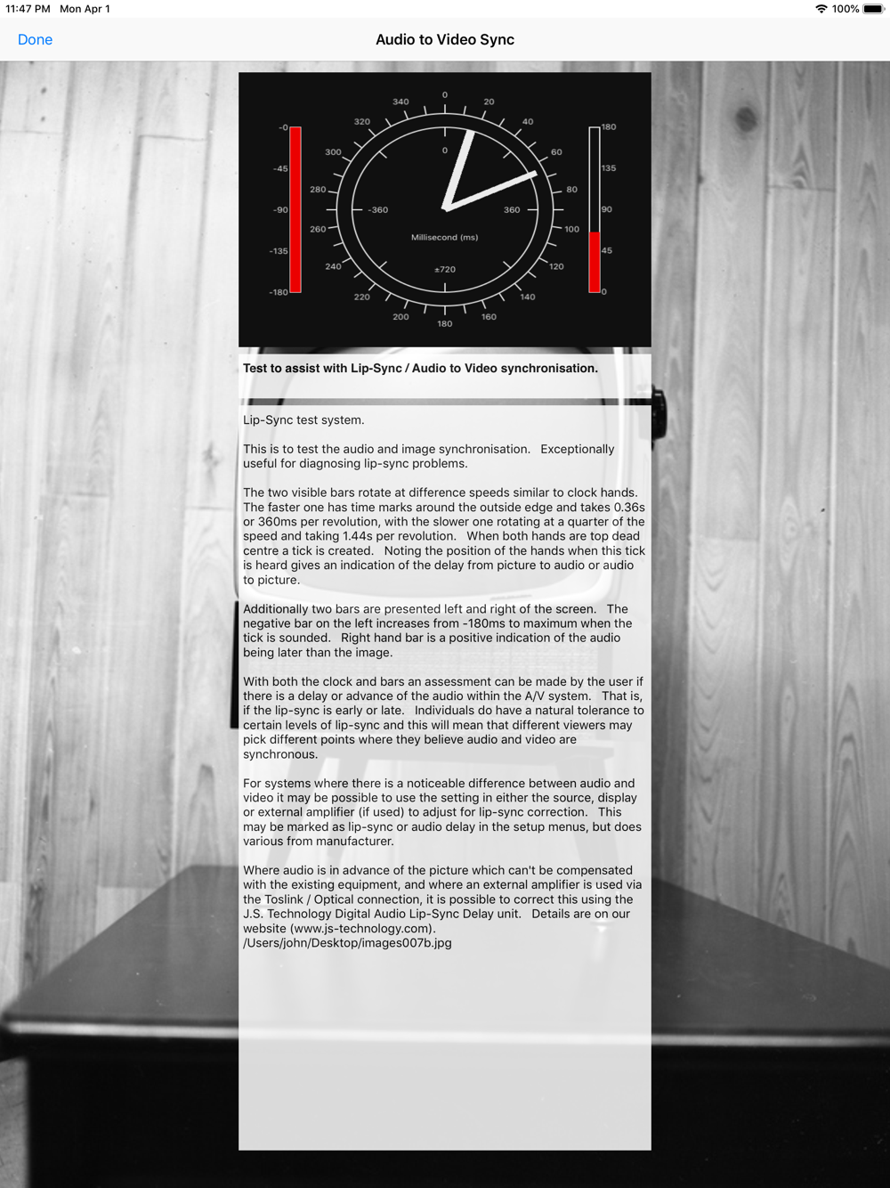 Access to the test cards on the external display, Virtual Blue Filter and the SPL meter are only available after an In-App purchase. Using the default test screen please ensure that you have tested your device with the media adaptor, or Apple TV, on the external display before purchasing access. This is to allow you to verify that your system is fully compatible before purchase, and to share a single purchase with your iOS devices and Apple TV.