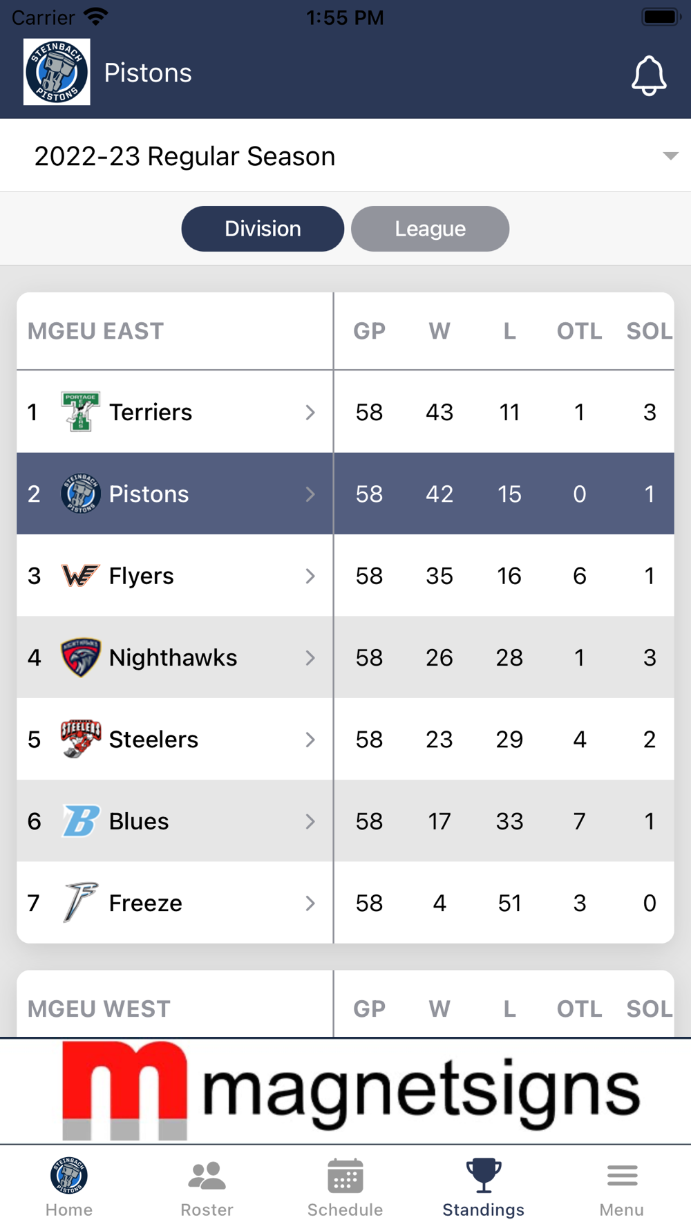 • Standings by Division, Conference and League