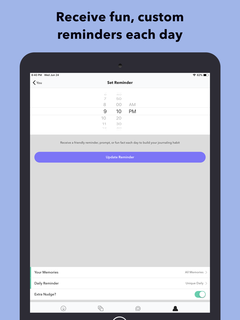 Every day we write a custom prompt to help you remember to record your feelings. It could be a quote about happiness, a fact about the day, or a joke to brighten your day and put you in a happy mood.