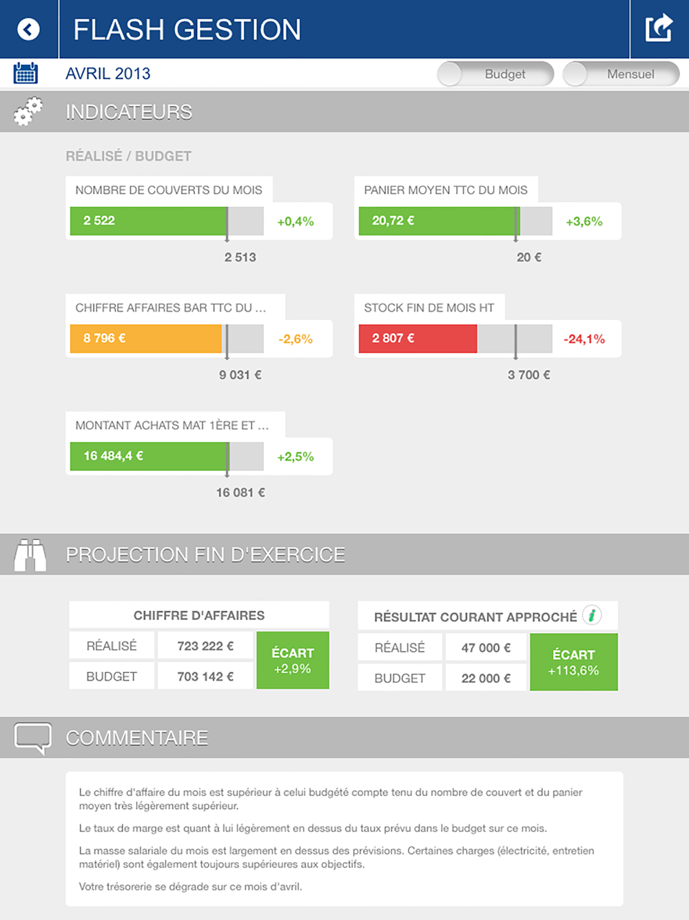 Indicateurs Flash, le tableau de bord des chefs d’entreprise. Indicateurs Flash publie mensuellement un suivi de gestion complété d’un comparatif sectoriel et d’une veille métier. Commenté par votre expert-comptable, il vous permet de prendre les bonnes décisions de gestion et d’envisager plus sereinement l’avenir. Son interface mobile est claire, visuelle et pédagogique.