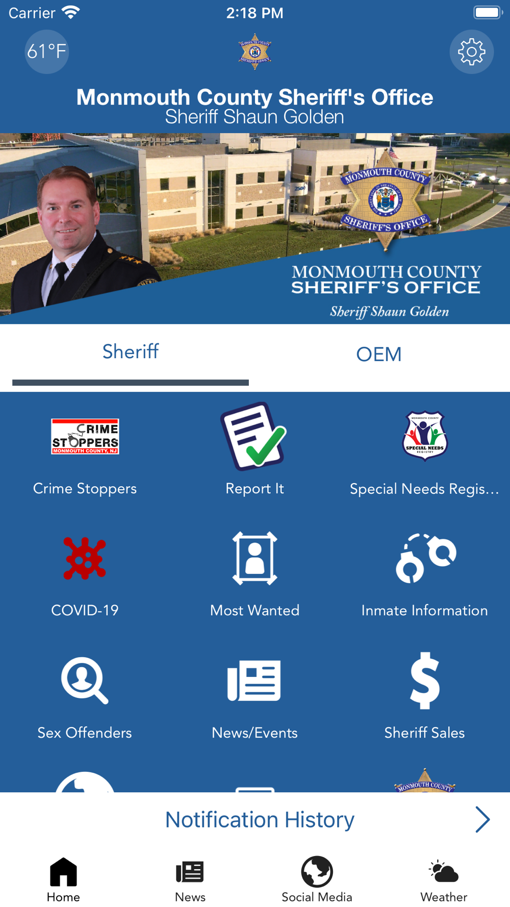 The Monmouth County Sheriff’s Office Application is an interactive application that will facilitate information to the general public in real-time. Such information will include, but not limited to contact information, news alerts, emergency alerts, local weather, event calendar, inmate search, Sheriff Sales and most wanted. By empowering people through technology, the Monmouth County Sheriff’s Office will be able to better protect our county.