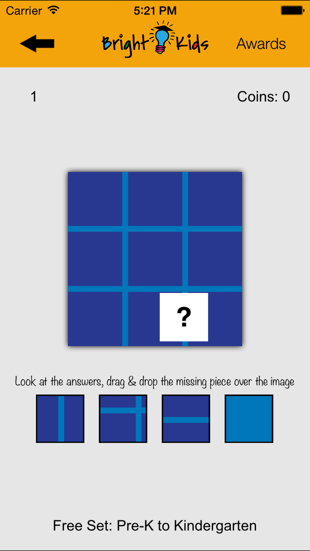 The NNAT®2 is designed to provide a nonverbal measure of a student’s general cognitive ability and is administered for placement into Gifted and Talented programs throughout the country. Students do not use their reading, writing, or speaking skills on the NNAT®2; instead, they must rely on visual reasoning and logic to solve the problems presented to them. The Bright Kids NNAT®2 app is the perfect way for children to acquire the skill-set required for the NNAT®2 exam, with questions suitable for children in Pre-K and Kindergarten, and more sets coming soon for 1st through 2nd graders.Children can master their skills through over 100 Pattern Completion questions and multiple difficulty levels. Each correct answer earns a credit that can be redeemed for in-app prizes. Solve all the questions and collect all the prizes!