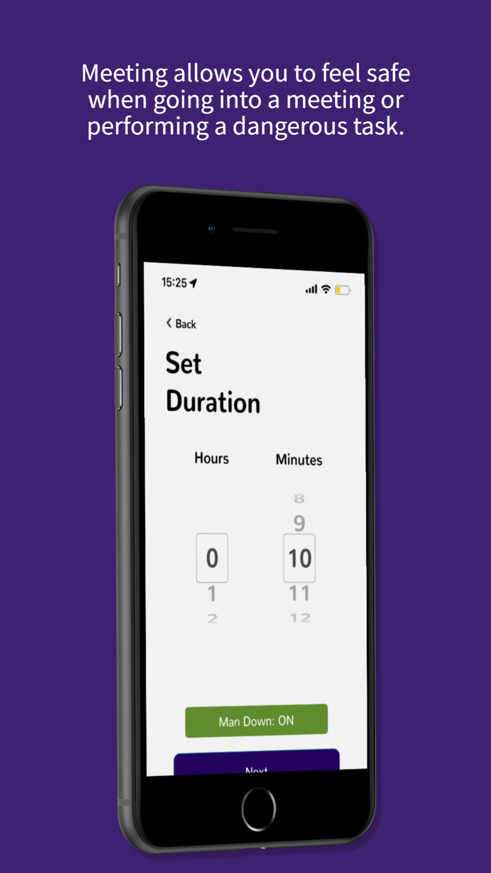 The Meeting Timer allows you to set up an expected meeting duration time. Once this is done, a countdown timer starts both on your phone, and remotely in our secure servers. This timer must be stopped within that period of time in order to prevent the alarm being activated in the RE:SURE Control Centre. If the alarm time needs to be extended a discrete push of a button can postpone it in 15-minute/1 hour intervals.