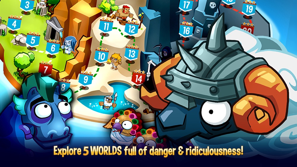 OMG: TD! is an ever-expanding universe of danger and ridiculousness. Unlock and level up the most powerful gods from Greek legend, and imbue them with special powers. Explore 46 thrilling levels set in 5 different worlds. Push your tactical skills to the very limit by playing the game in challenge mode. Battle the terrible Titans and their armies and see who comes out on top!