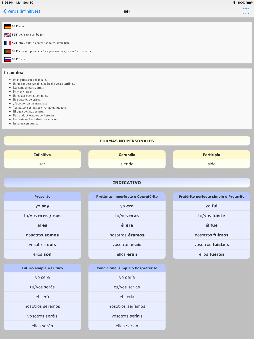 ◉ Search in all tenses. (For example: You will find the verb "ser" by searching for "soy".)