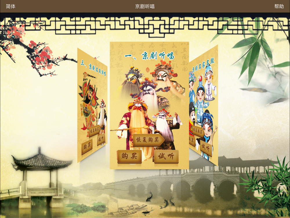 《京剧听唱》产品提供了100首名家演唱的精彩的京剧名段,演唱时,歌词同步显示;我的作品,便于用户管理自己演唱的京剧唱段;产品还配有京剧名段曲目赏析。