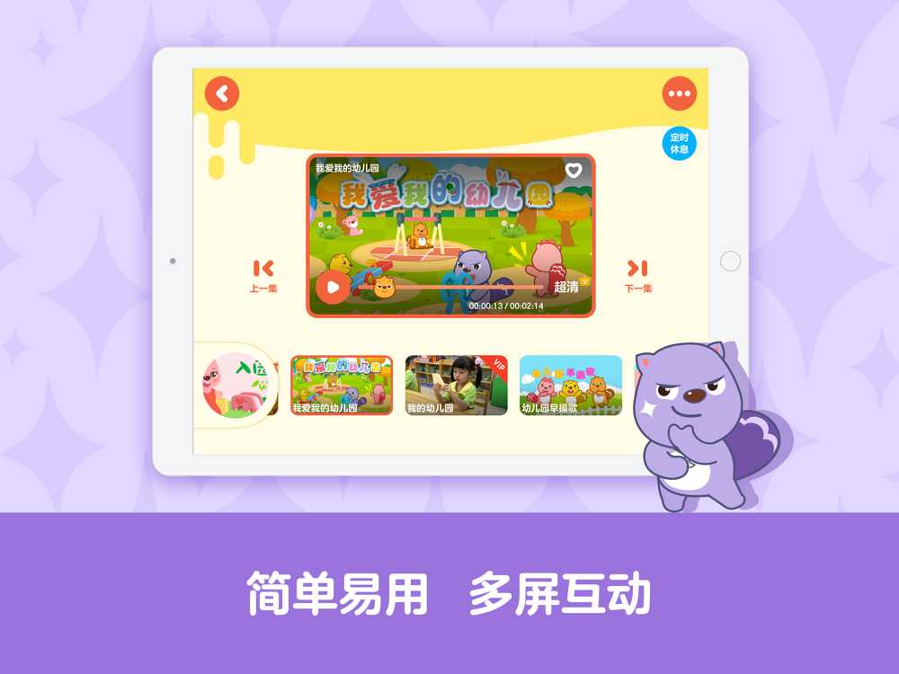 视频播放界面大屏大按钮,简单易用,1岁宝宝即可轻松自主选择内容,给予家长更多自我空间。内容分龄且支持场景推荐,包括叫早、哄睡、运动等多模式需求。支持手机、Pad、智能电视等多种终端设备,随时随地方便使用。