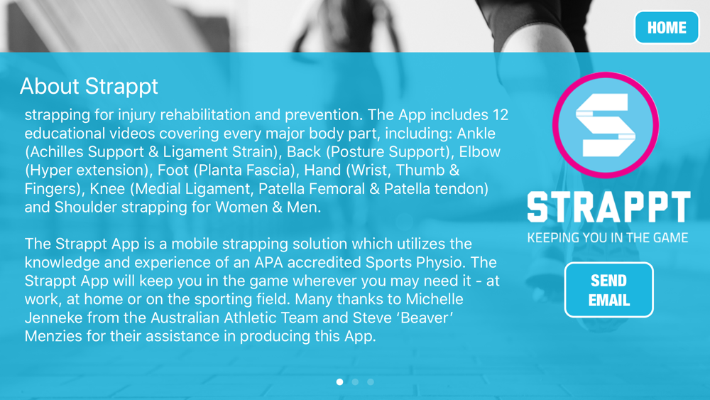 The Strappt App is a mobile strapping solution which utilizes the knowledge and experience of an APA accredited Sports Physio to educate and assist in the art of joint strapping for injury rehabilitation and prevention. The Strappt App will keep you in the game wherever you may need it - at work, at home or on the sporting field. The App includes 12 educational videos covering every major body part, including: Ankle (Achilles Support & Ligament Strain), Back (Posture Support), Elbow (Hyper extension), Foot (Planta Fascia), Hand (Wrist, Thumb & Fingers), Knee (Medial Ligament, Patella Femoral & Patella tendon) and Shoulder strapping for Women & Men.