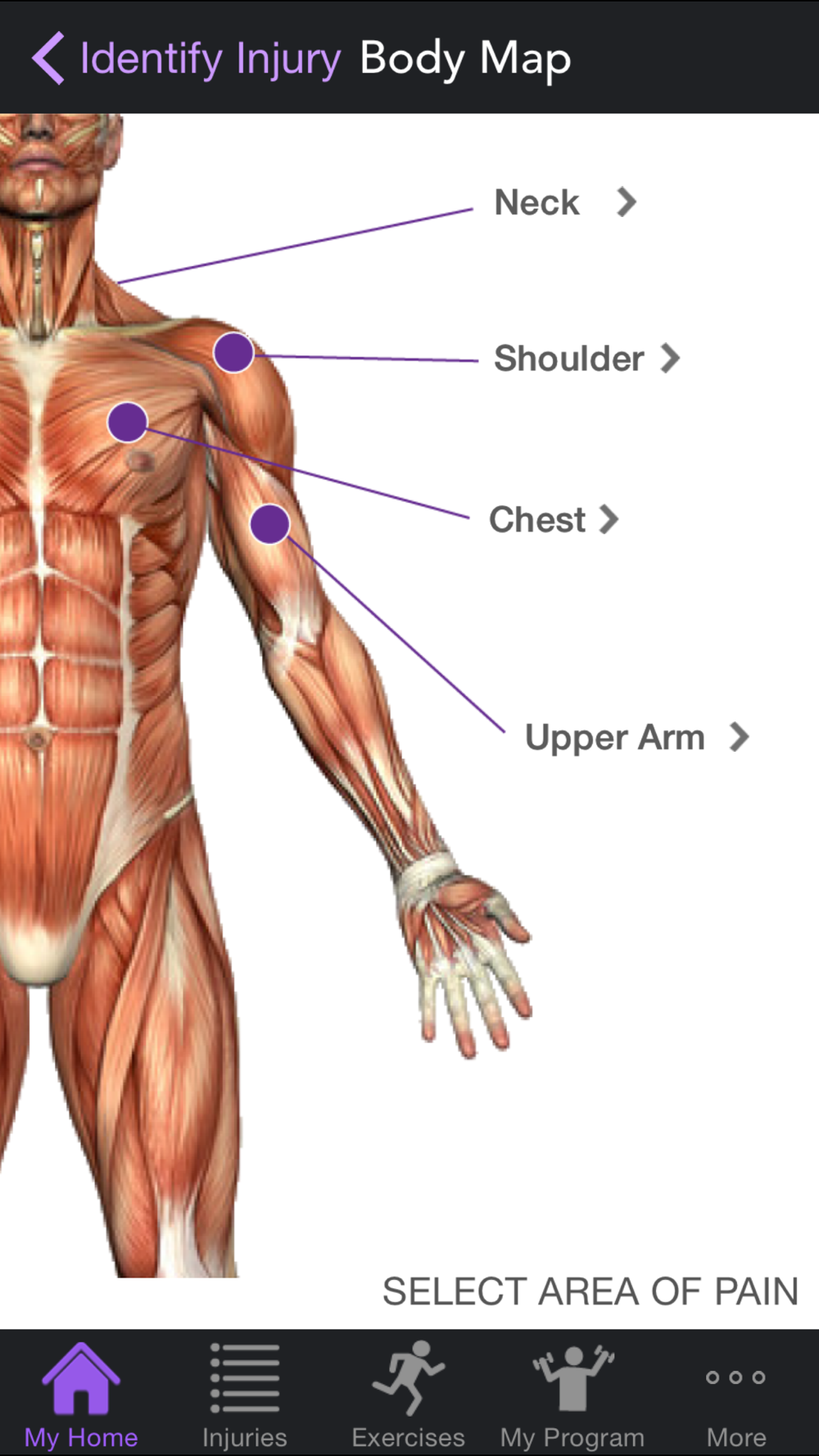 The injury identifier feature found within the app allows users to filter through a variety of descriptions that could possibly identify the shoulder injury that you are suffering from. When selecting the area of pain the user is prompted with a detailed description of specific symptoms that would be associated with a particular injury. The user is prompted to select the symptoms that best describes what they are feeling.