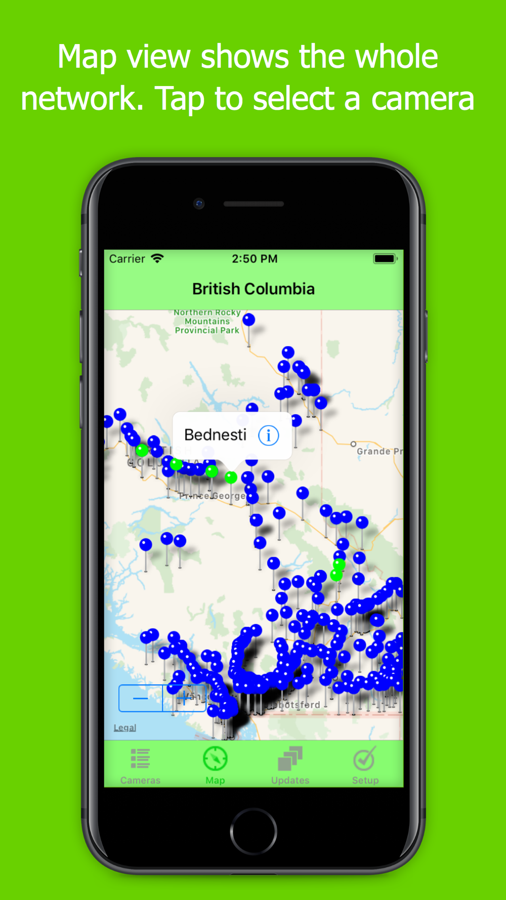 BC Highway includes Apple maps to show the location of each camera location. Touch a camera icon to select the camera view. Touch the Map button on a camera page to see the location map
