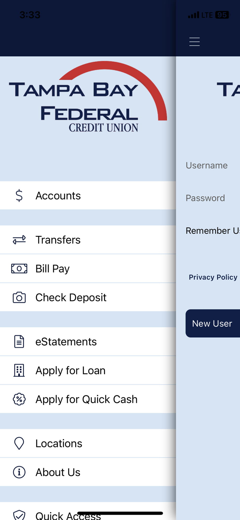 Tampa Bay Federal Credit Union's mobile app provides easy and secure access to your Tampa Bay FCU accounts. Easily check your balances, view transactions, make transfers, deposit checks, pay your bills, or find nearby branch locations or ATMs. Tampa Bay FCU's mobile app is available to all Tampa Bay FCU members.
