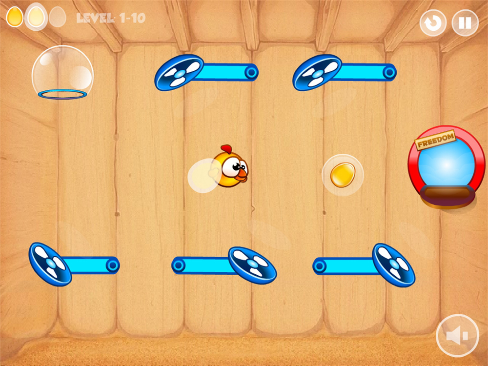 Help a brave bird regain his freedom in a new puzzle game with fun challenges. He is trapped in a bubble and the road is full of dangerous spikes that can hurt him. Use the fans to guide the little one safely to the exit and try to collect all the golden eggs for a high score.