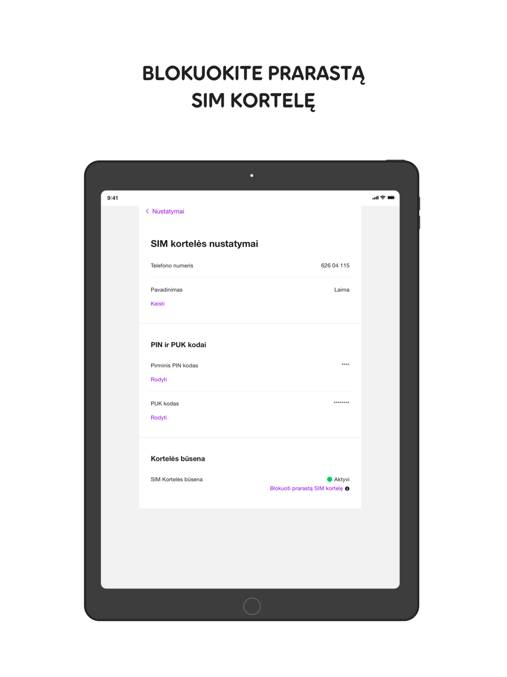 - blokuoti/atblokuoti prarastą SIM kortelę;