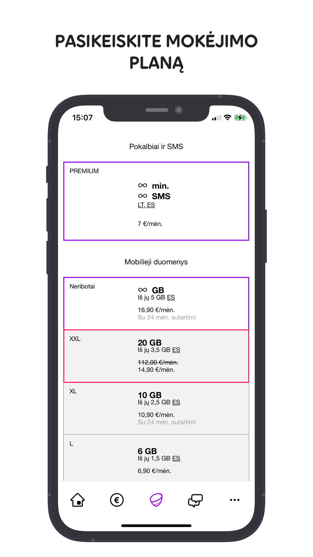 - peržiūrėti mobiliojo ryšio sąskaitas bei išklotines;