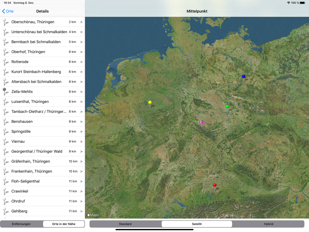 Diese App bietet dir einen komfortablen Weg, den Mittelpunkt von bis zu 9 Orten zu berechnen.