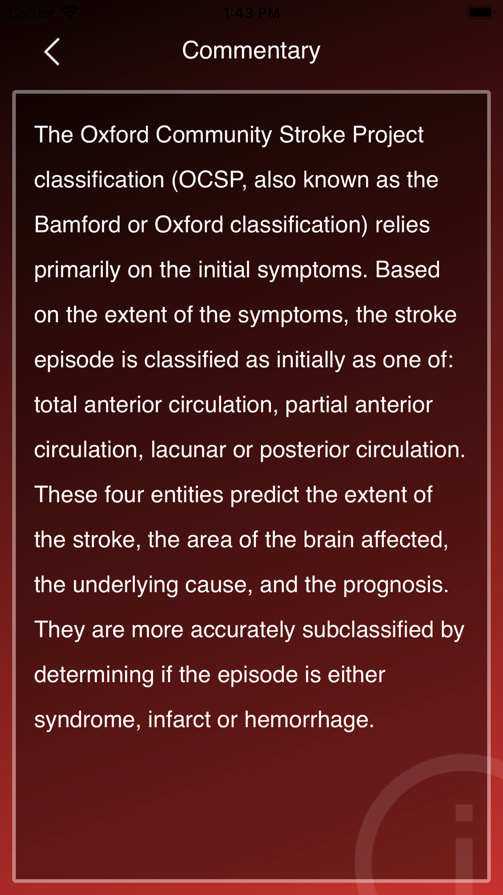 From the creators of the original iOS Clinical Diagnosis App range comes the new and improved Oxford Community Stroke Project (a.k.a. the Bamford scale), which is the premier assessment tool for providing a classification of Acute Ischemic Strokes.