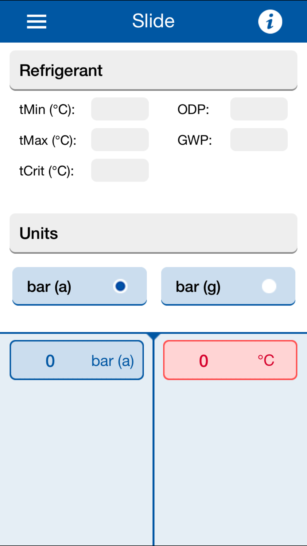 - Refrigerant slide: Display of the pressure-temperature correlation for common refrigerants; including ODP and GWP values