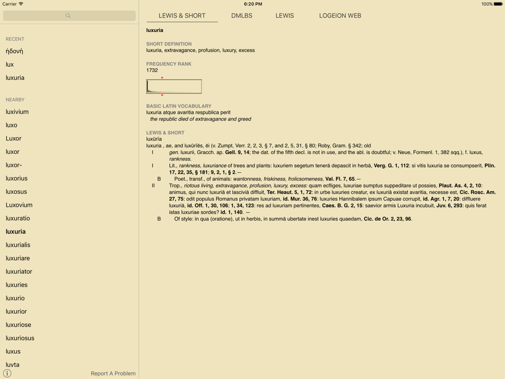 Use one app to look up any Greek or Latin word: Logeion was developed at the University of Chicago to provide simultaneous lookup of entries in the many dictionaries and reference works that make up the Perseus Classical collection. Most works represented in this app are based on digitized texts from the Perseus Digital Library at Tufts University. In addition, for frequent words, some frequency and collocation information is given plus examples from the corpus at perseus.uchicago.edu.