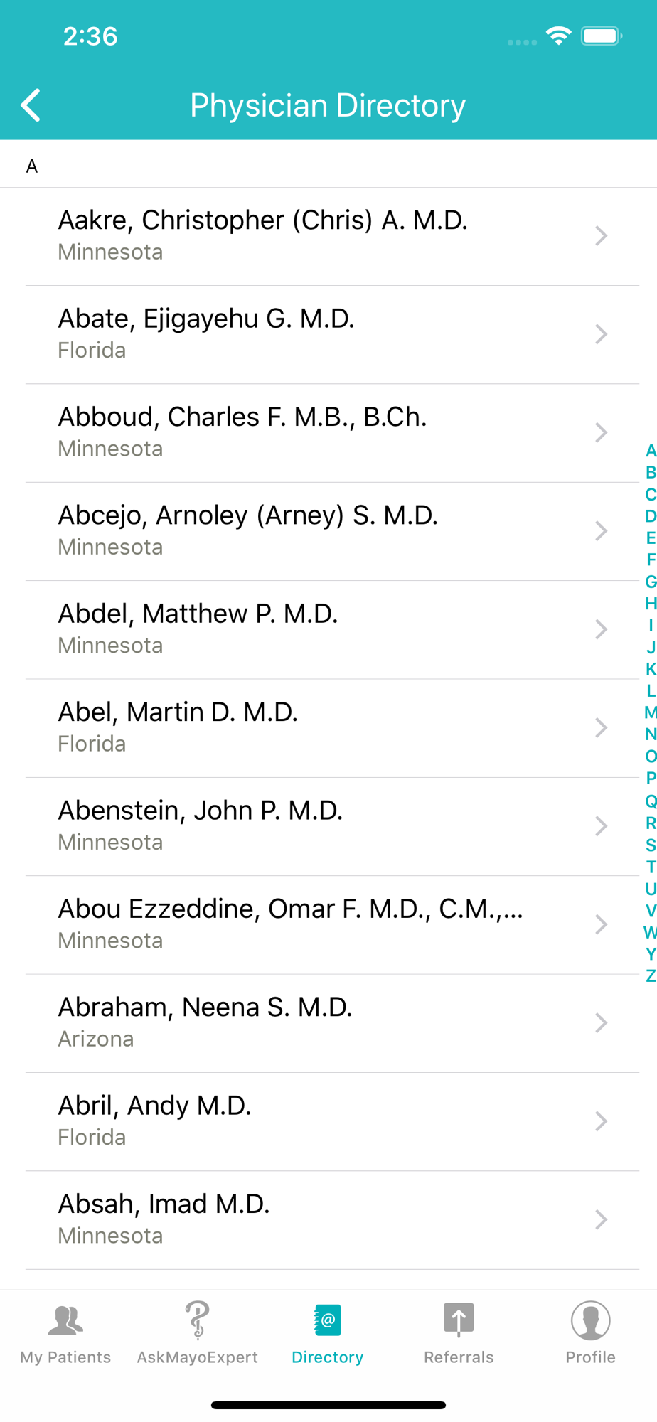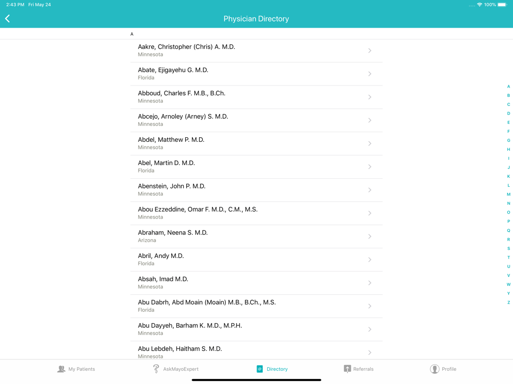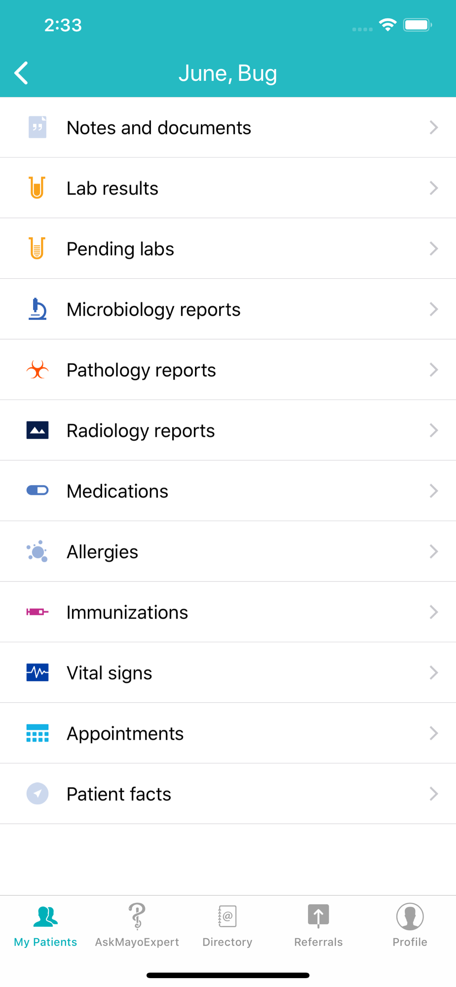 The Mayo Clinic for Medical Professionals app enables you to view clinical data for patients you have referred to Mayo Clinic for care. The Medical Professionals app is an easy-to-use tool for navigating the following information: