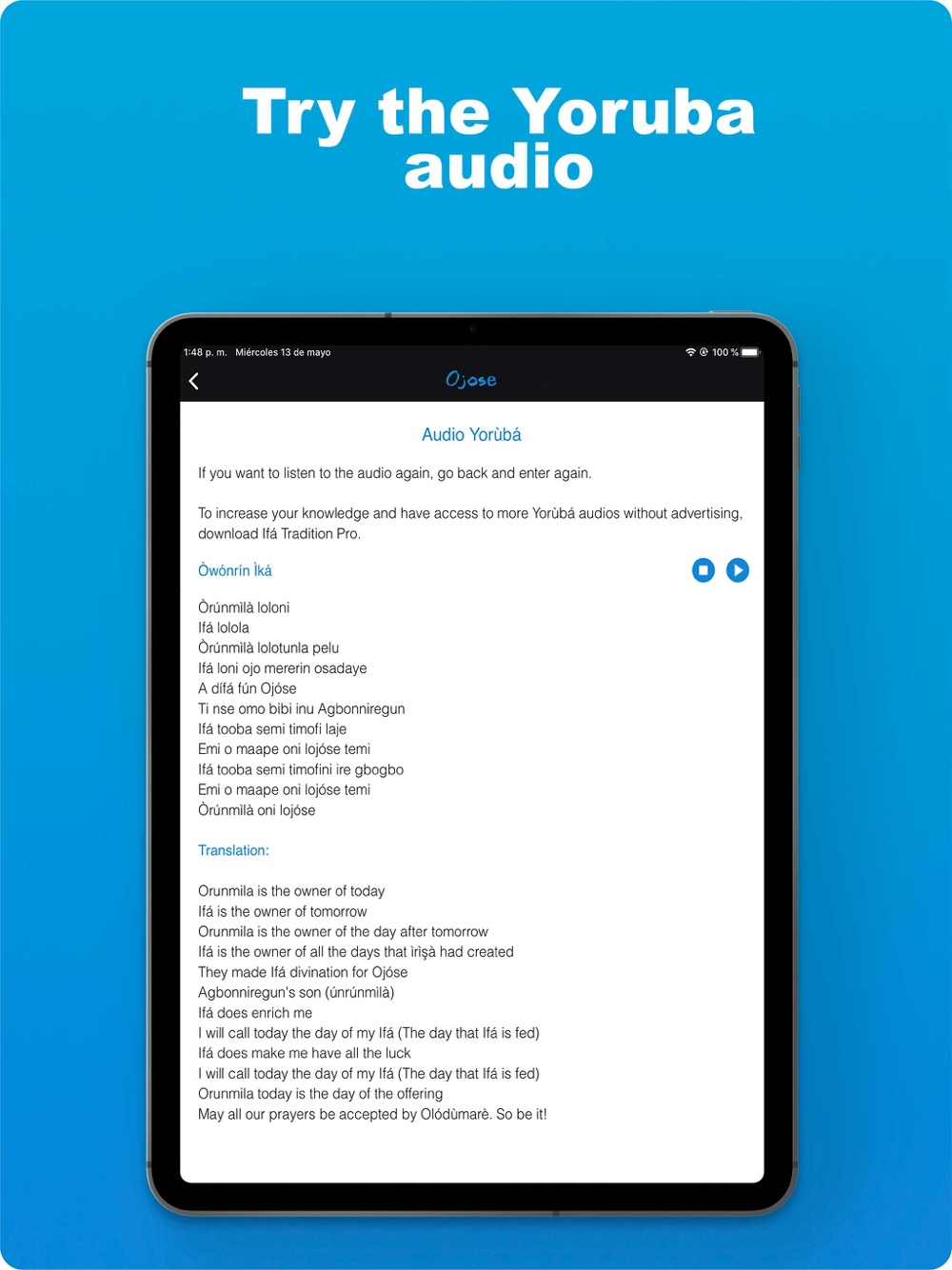 If you want to deepen your knowledge of Ifá, download our other applications: Ifá Tradicional Pro, Ojú Odù and Apola Ogbè.