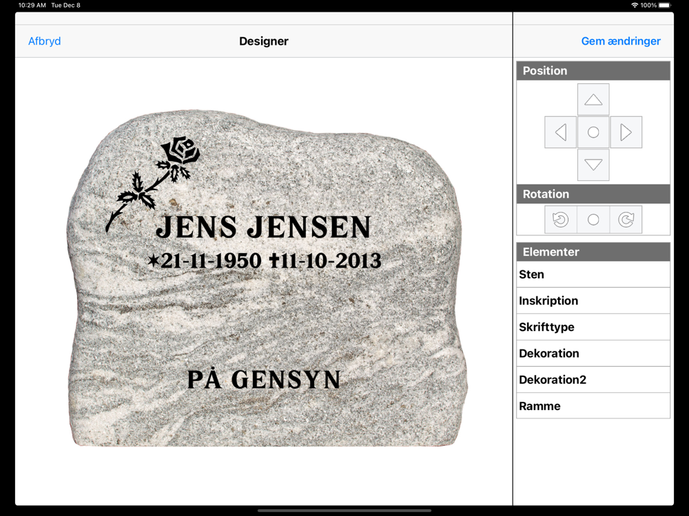 Applikationen giver mulighed for indtastning af alle relevante informationer, samt valg af diverse elementer der måtte ønskes på den pågældende sten og det er muligt via designeren at flytte rundt på og forstørre elementerne. Når bestillingen er klar, sendes denne direkte til Danske Stenhuggerier, der varetager resten af processen.