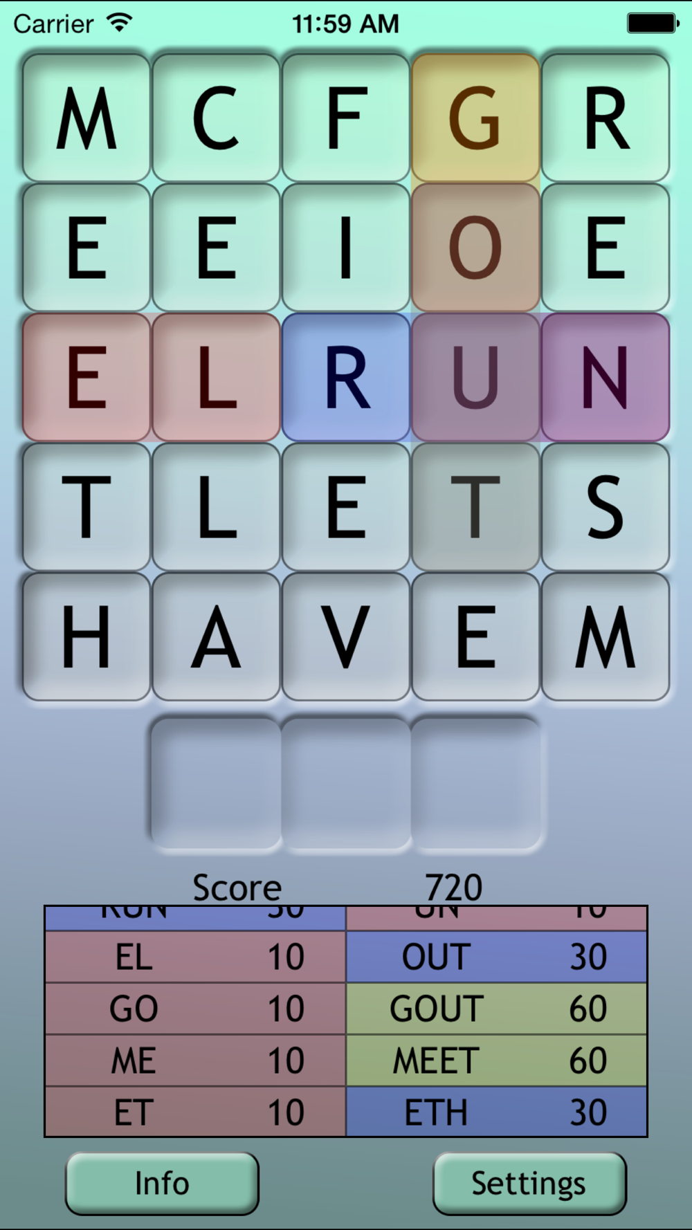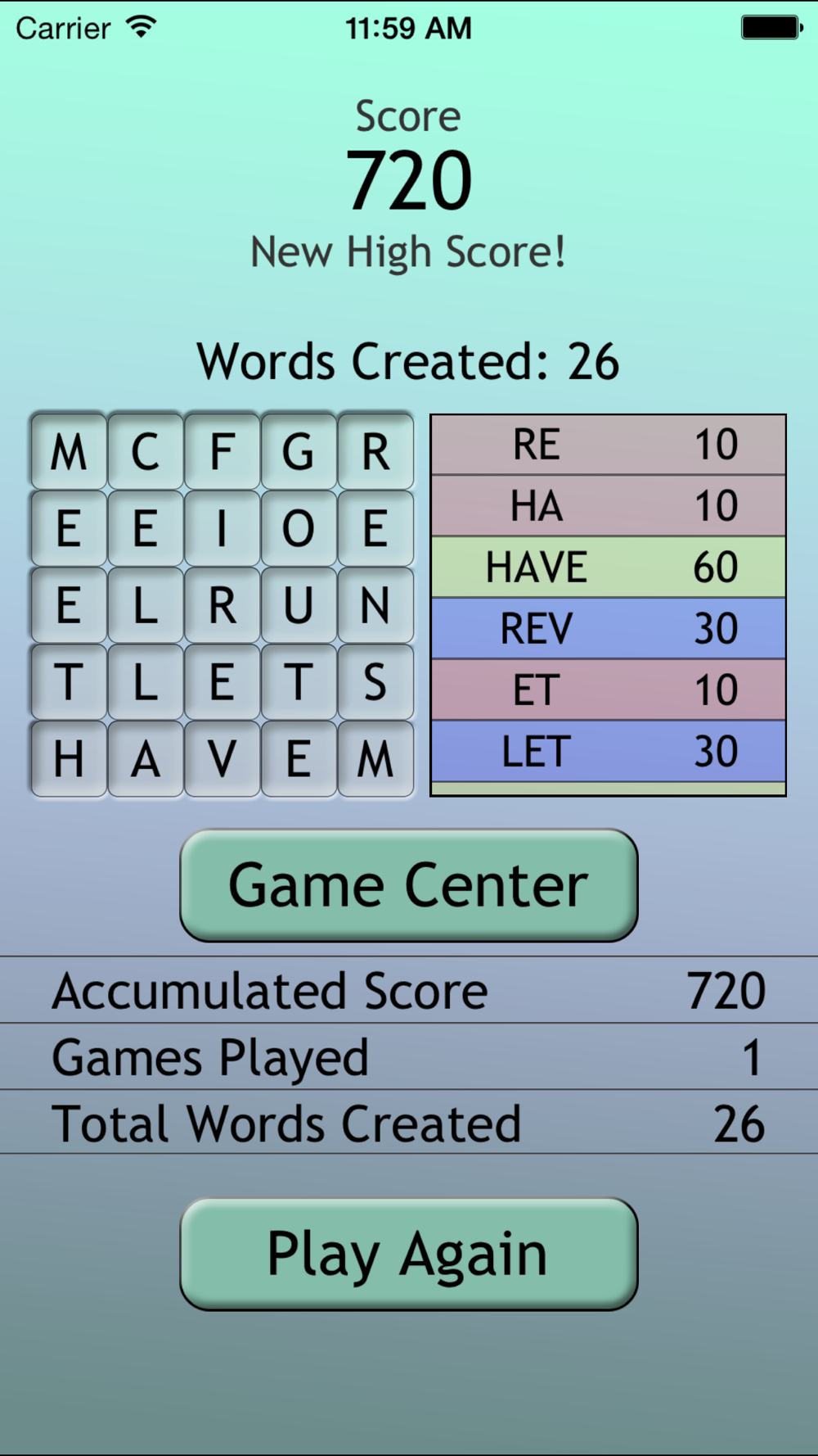 Words can either go from top to bottom or left to right. Longer words will give you more points. See just how high of a score you can get with the letter board you made from your "kit".