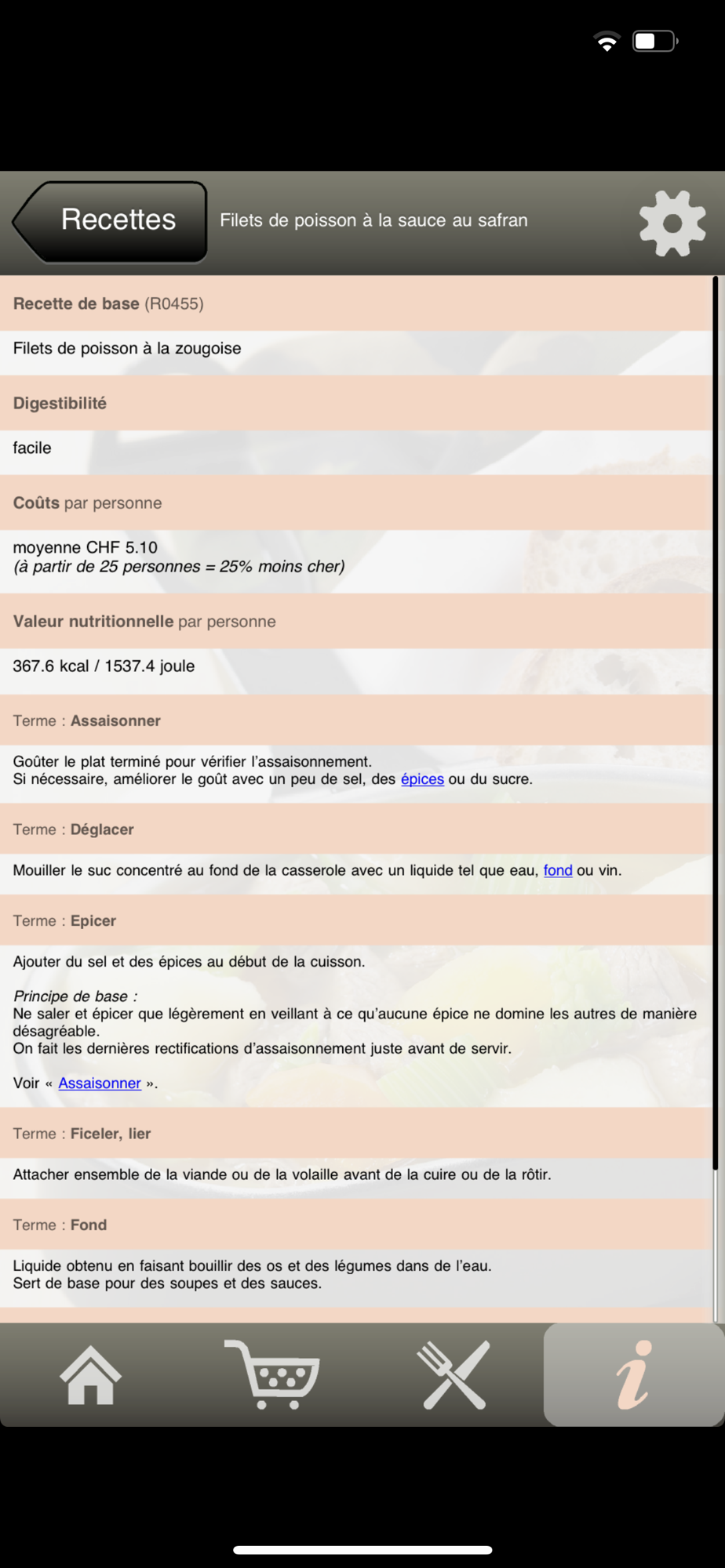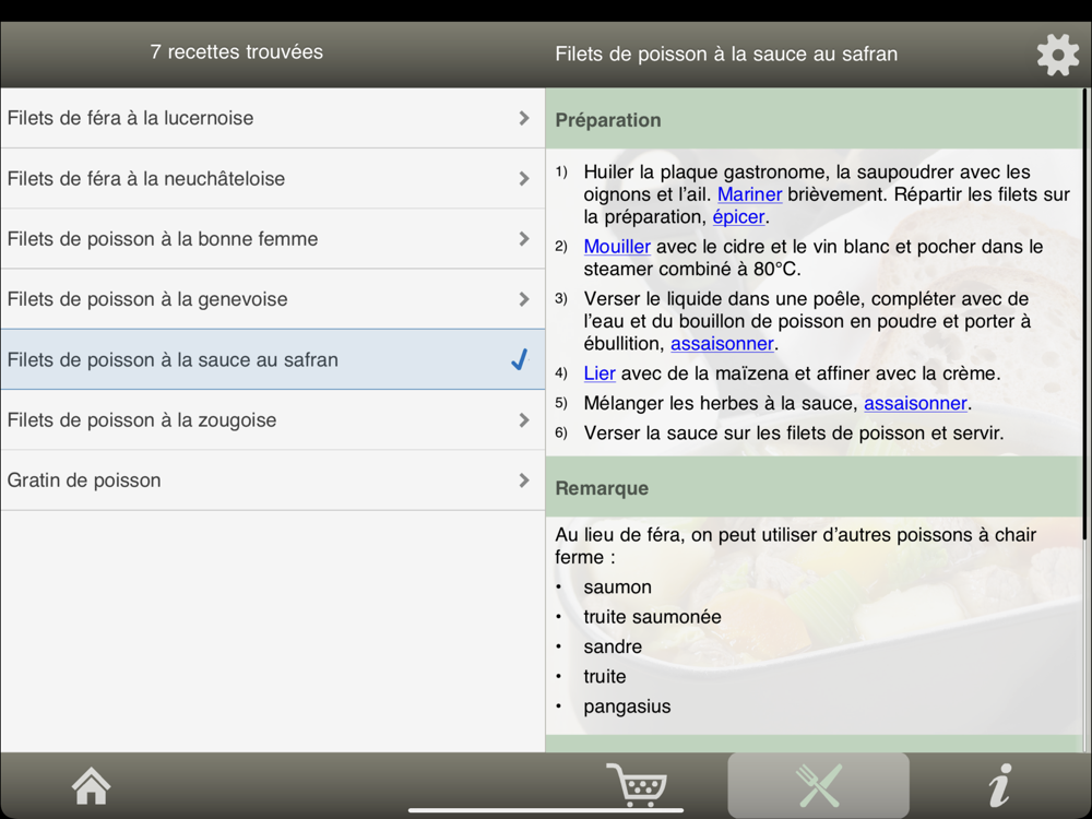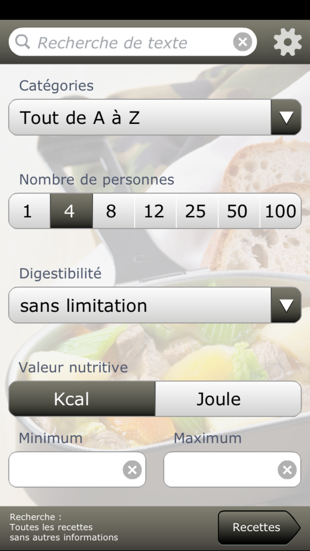 Le Récepteur présente de savoureuses recettes issues de la cuisine militaire suisse. Les critères de recherche « Catégories », « Nombre de personnes », « Digestibilité » et « Valeur nutritive » permettent de trouver plus facilement une recette adéquate. Les quantités sont calculées en fonction du nombre de convives. Bien entendu, l’application montre également comment préparer la recette choisie.