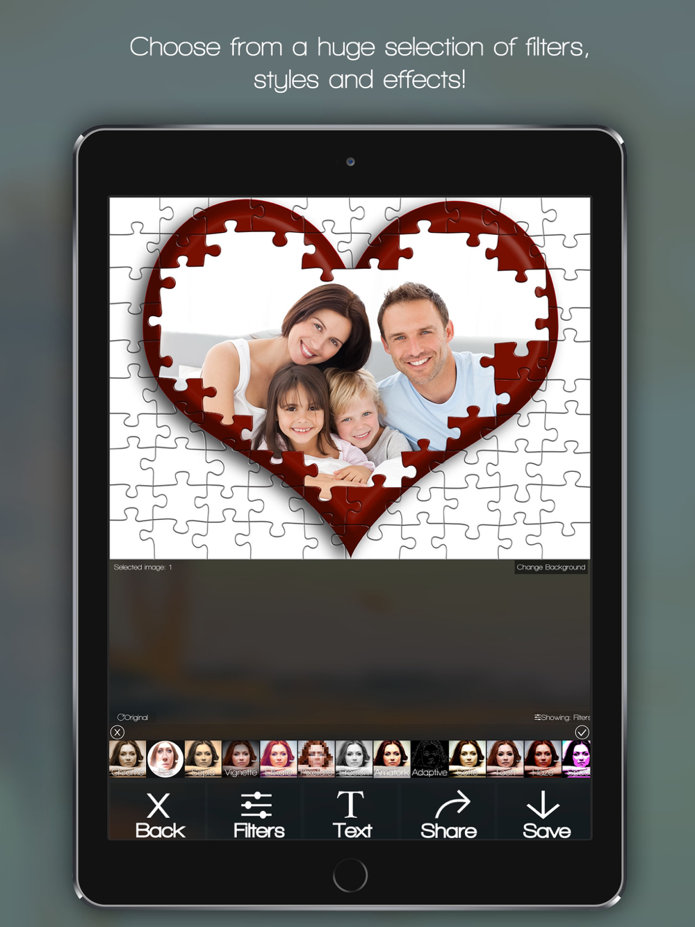 Collage Collection is the premier app that will turn your photos into masterpieces, allowing you to create and share your own unique artwork with friends and family on Instagram, Facebook and Twitter. With a simple and intuitive interface, choose between dozens of frames, filters, effects, fonts, styles, and colors to perfectly reinvent your photos into breathtaking collages.