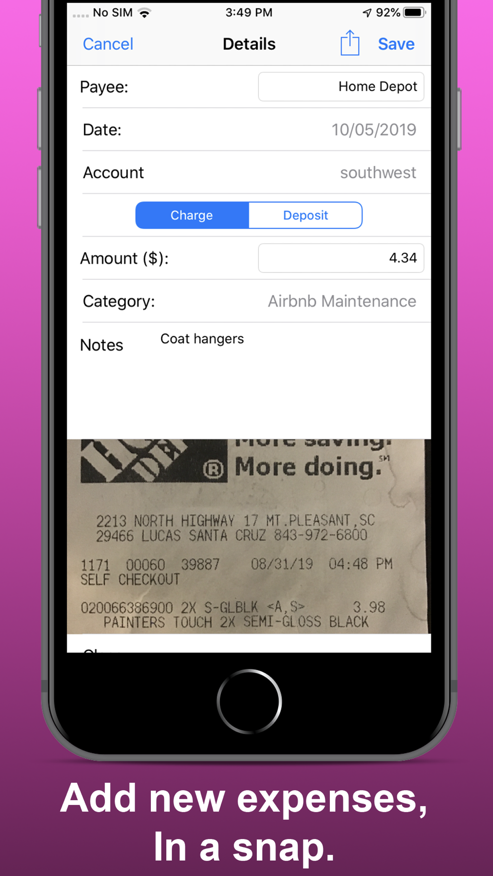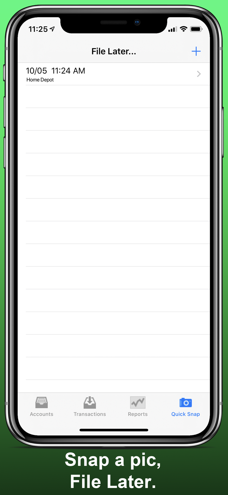Quickly Capture a picture of a receipt using Quick-Snap and come back to the app to file it later when you have time.