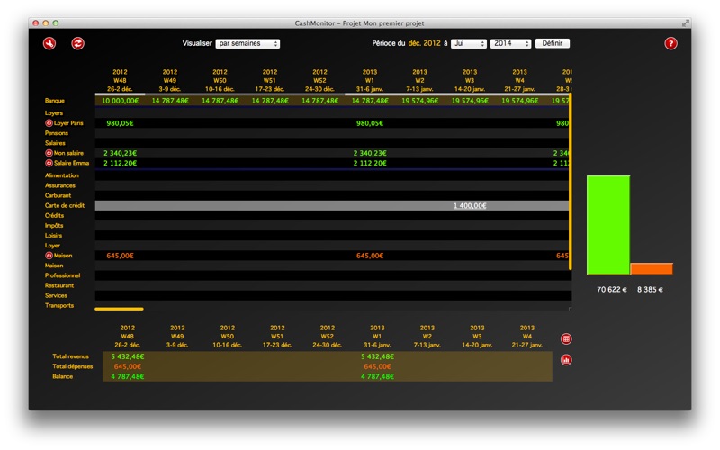 Vous aurez le choix entre la saisie de vos données à la semaine ou au mois, et de passer de l'un à l'autre en un clic de souris. Vous aurez aussi la possibilité de saisir des dépenses ou recettes récurrentes comme des loyers, salaires et taxes par exemple.