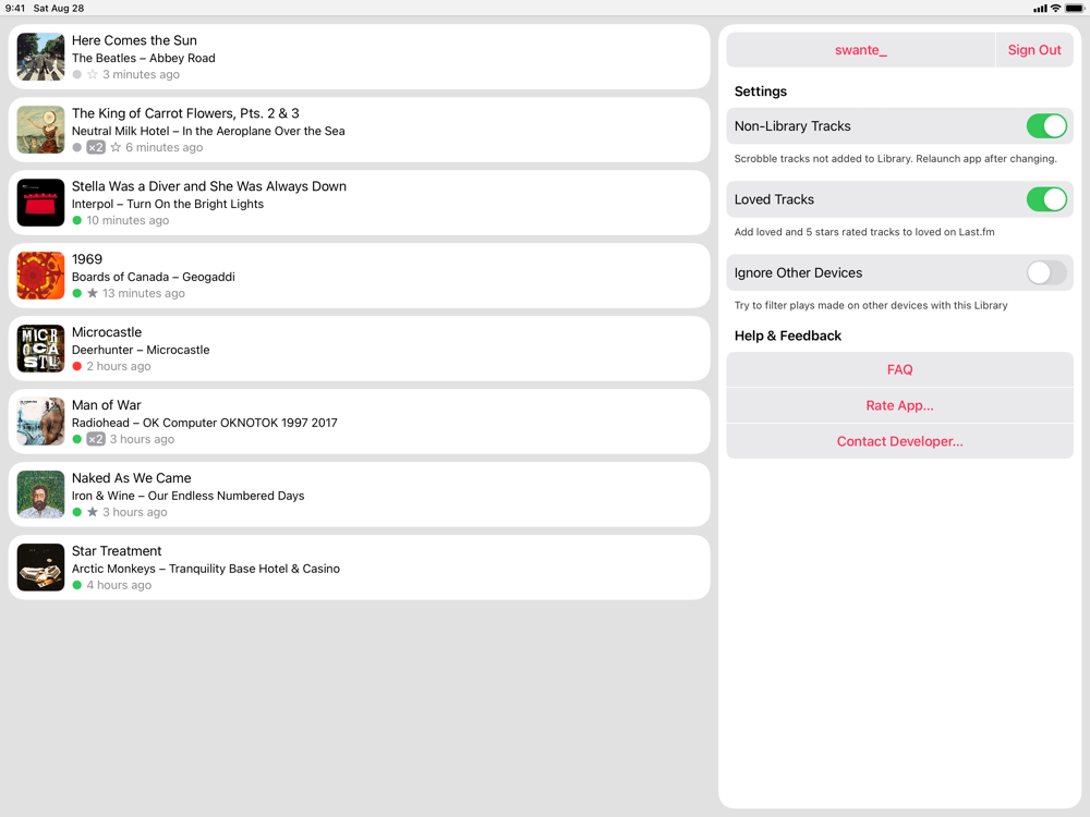 QuietScrob is a simple yet powerful Last.fm scrobbler for Apple Music. Launch it from time to time or just leave in background and listen to music, QuietScrob will sync listened tracks with your Last.fm profile.
