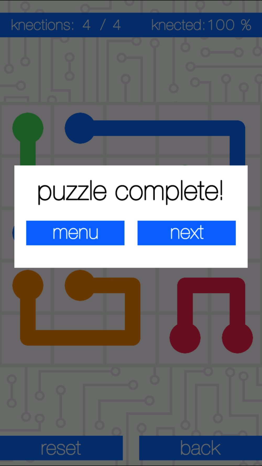 Finished this game? Try the knx2 app now on the app store, which adds another 570 levels, a hex grid, and diagonal connecting lines too!