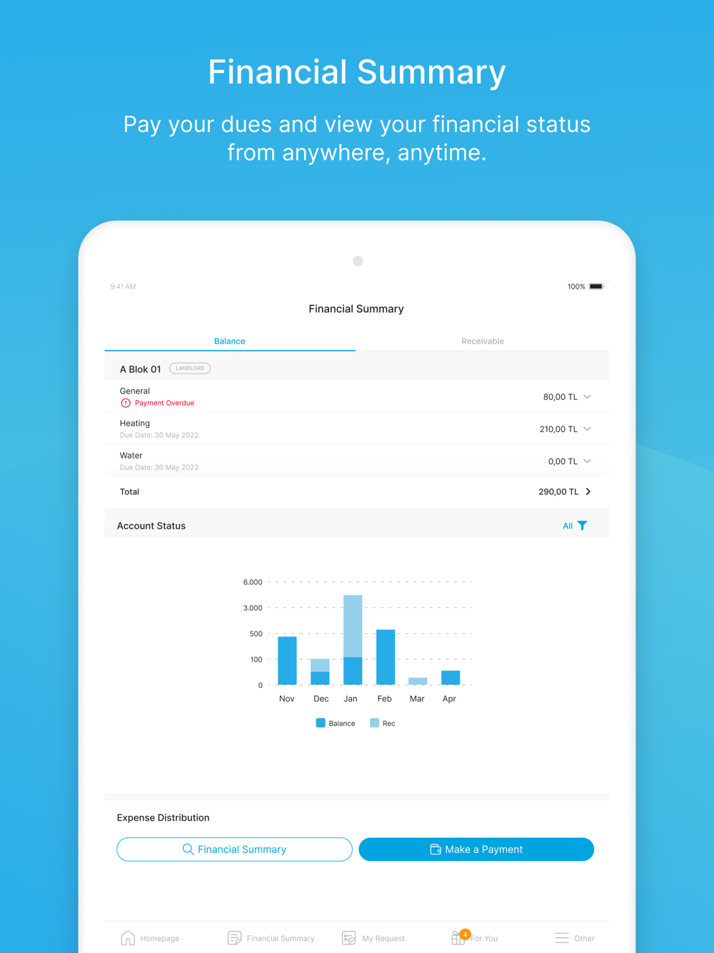 Make rental contract, monitor debts and make payment whenever you want.
